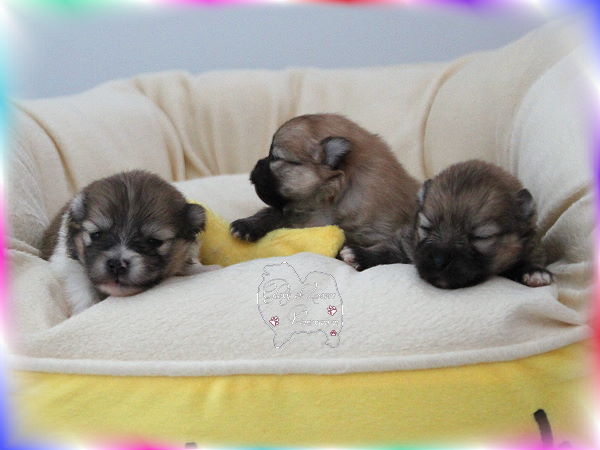 Die Zeit vergeht so schnell! Nun sind die Kleinen schon wieder 2 Wochen alt. Die Jungs haben die Augen schon geöffnet und das Mädel blinzelt auch schon durch einen kleinen Schlitz. Leider waren die Welpen bei den Aufnahmen satt und total müde. Da sind dann die Köpfchen immer so schwer und Lust zum Wandern hat man da auch nicht. Deshalb heute auch kein Video.